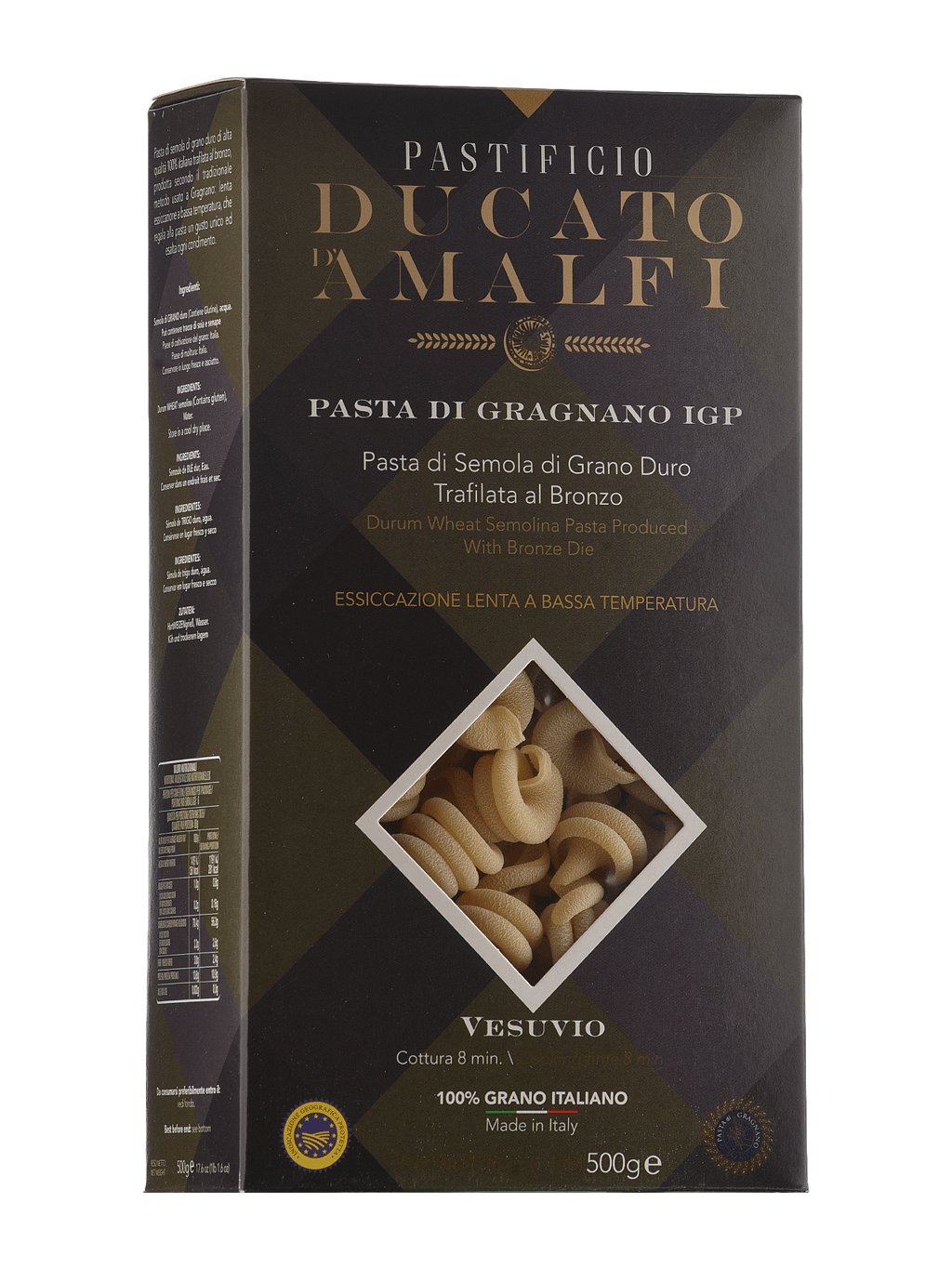 Speciální druh těstovin nazývaný Vesuvio kvůli své podobnosti se slavnou sopkou. Je ideální pro jednoduché omáčky z čerstvých rajčat a bazalky nebo jako základ pro recepty „Mare e Monti“, které kombinují ingredience z moře i ze země. Vyrobeno z vysoce kvalitní semoliny a vody z pramenů Monti Lattari.
