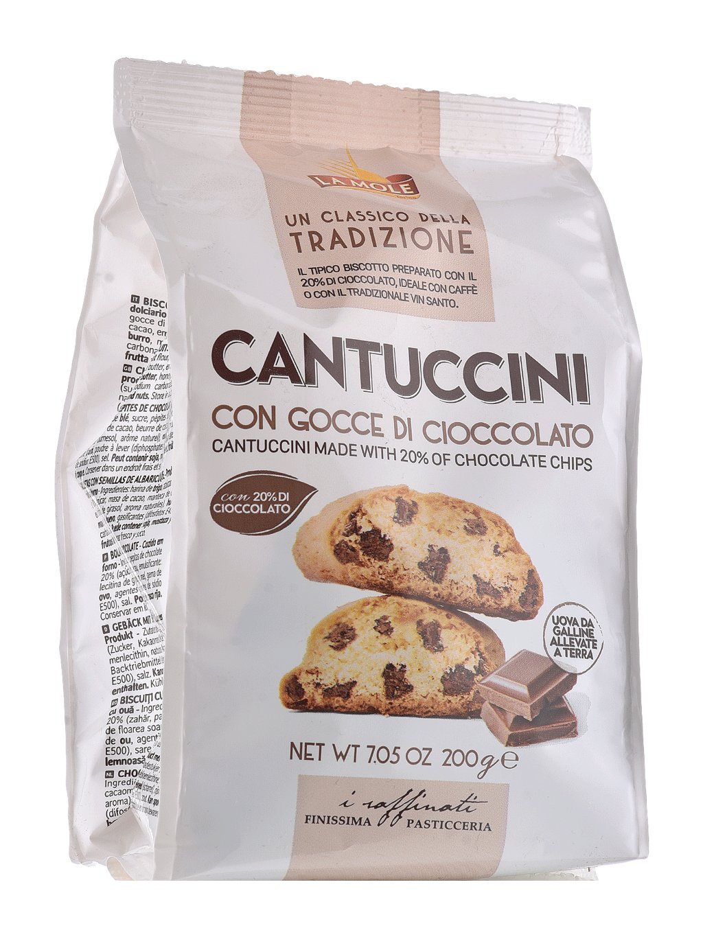 Dvakrát pečené toskánské cantuccini s kousky čokolády. Zlatavě hnědé, krásně křupavé a voňavé sušenky, ideální k espressu nebo cappuccinu, nebo jako sladká tečka po jídle.