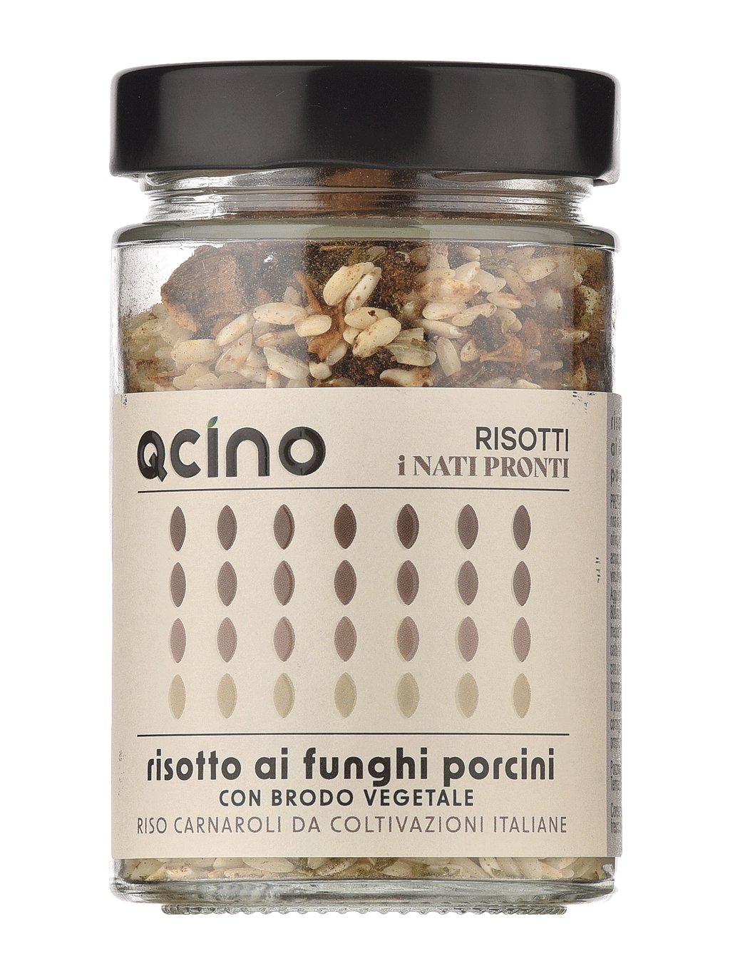 Složení: italská rýže Carnaroli 94%, zeleninový vývar (sůl, sušená zelenina (rajčata, cibule, mrkev, česnek), cukr, aromatické bylinky, koření, aroma, slunečnicový olej), sušené houby 2,5% (Boletus Edulis a příbuzné), petržel.