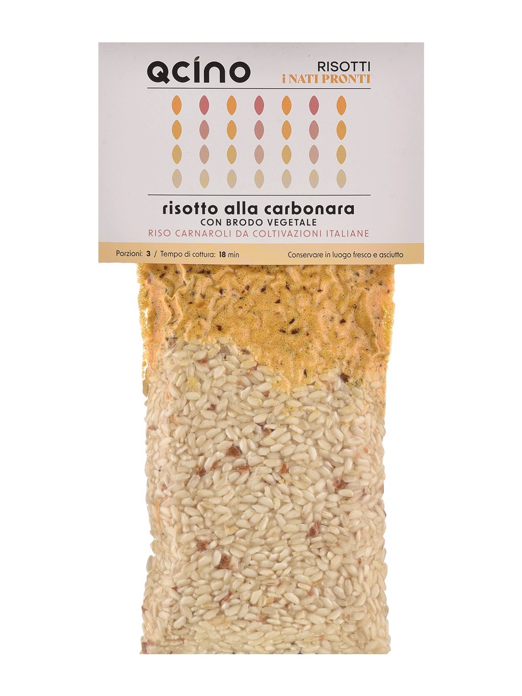 Složení: italská rýže Carnaroli 84%, sušený vaječný žloutek 5%, sušená slanina (vepřové maso EU), sýr Pecorino (ovčí mléko, sůl, syřidlo), zeleninový vývar (sůl, sušená zelenina (rajčata, cibule, mrkev, česnek), cukr, aromatické bylinky, koření, aroma, slunečnicový olej), černý pepř.