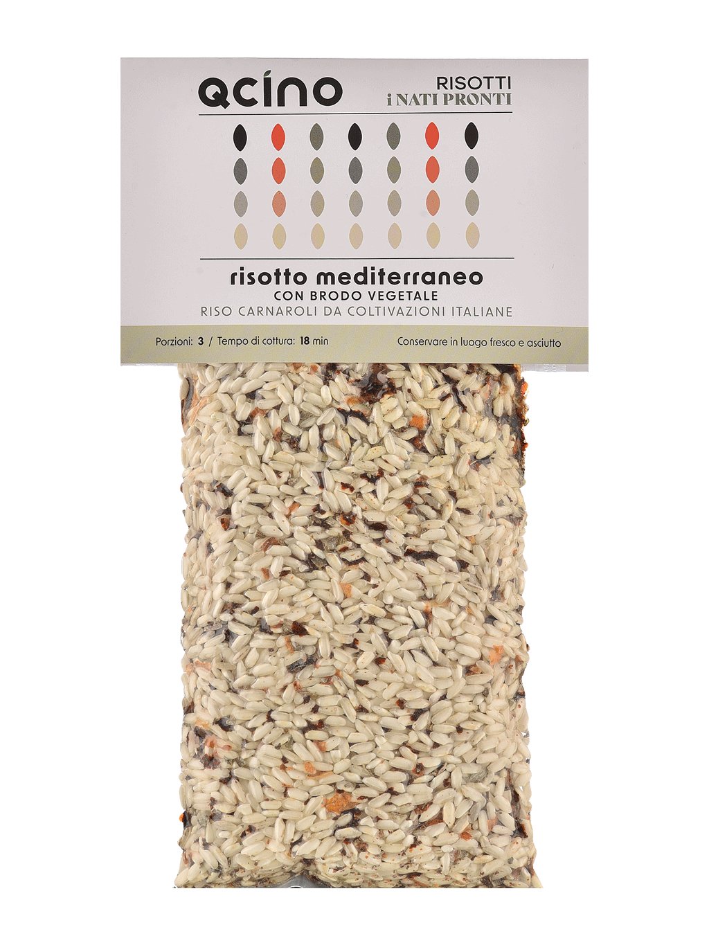 Složení: italská rýže Carnaroli 88%, sušená rajčata 5%, olivy v různém poměru 2% (černé a zelené olivy), zeleninový vývar (sůl, sušená zelenina (rajčata, cibule, mrkev, česnek), aromatické bylinky, koření, aroma, slunečnicový olej), sušené kapary, sušená bazalka, cibule.