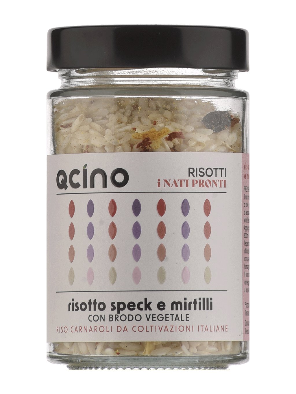 Složení: italská rýže Carnaroli 90%, zeleninový vývar (sůl, sušená zelenina (rajčata, cibule, mrkev, česnek), cukr, bylinky, koření, aroma, slunečnicový olej), sušené borůvky 3%, slanina IGP 2,7% (vepřové maso, sůl, koření, dextróza, konzervant: E250, antioxidant: E301, rýžová mouka, sůl, aroma.